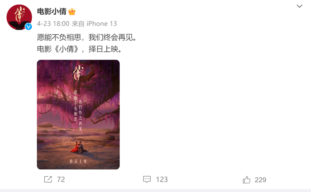 4月21日,《小倩》撤档,光线传媒高管在几日后的投资者交流会中解释原因,一是五一档不算大档期,上映影片数量过多,导致排片比例低,营销成本上升,二是影片上映时间距完成时间比较短,相关营销宣传还未完全展开。