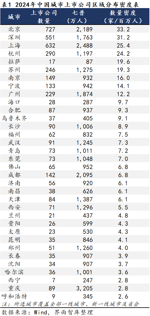 除了这些一线城市,我们也注意到一些新一线城市在上市公司数量密度上表现不俗。例如,杭州、苏州、南京等城市,尽管与北京、深圳、上海等一线城市相比仍有一定差距,但它们的数量密度也均超过了15家/百万人。另外,拉萨的上市公司数量密度也相当突出,达到了19.6家/百万人。