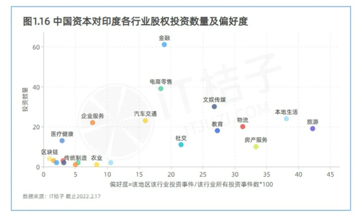从偏好度来看,中国资本对印度社交、旅游、房产服务、本地生活服务几个领域的偏好度较高。