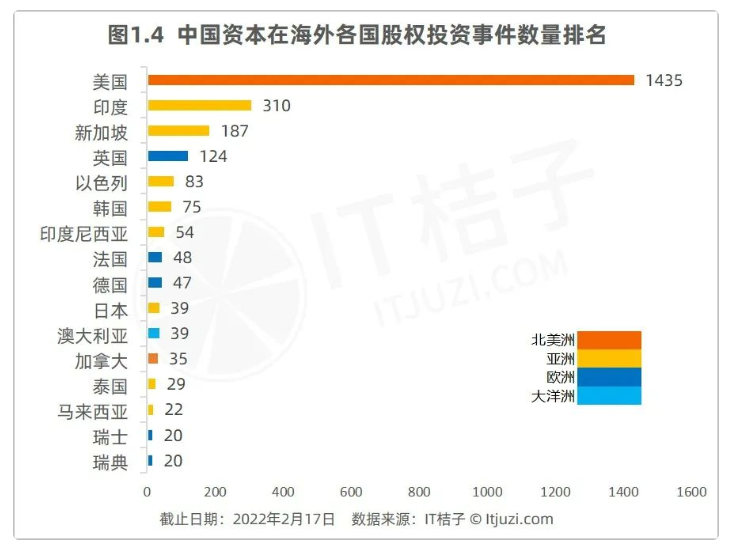 IT桔子数据显示,根据中国资本在海外各国的股权投资事件数排名,中国资本在海外投资事件数达到 20 起的有 16 个国家。从地区分布来看,亚洲国家数量最多,有 8 个;其次,是欧洲有 5 个国家,剩下 2 个国家在北美,还有一个在澳洲。