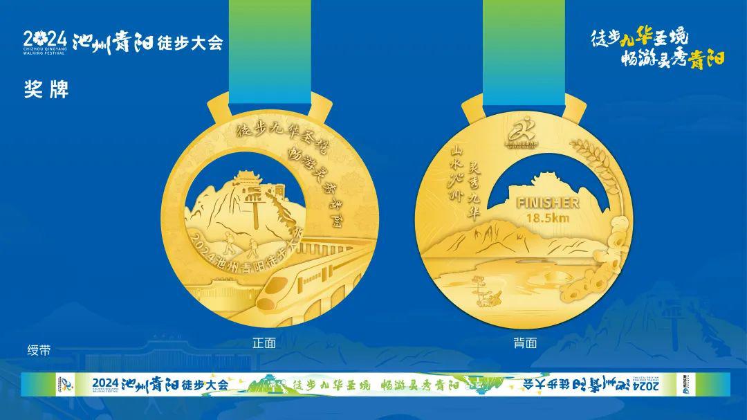 奖牌整体围绕赛事主题呈异形镂空设计。奖牌正面以高铁动车与著名风景区九华山作为主要元素,镂空处天台高耸云端,徒步者行走在圣境之中,充分彰显了青阳独特的风景与魅力。奖牌背面以青阳县特产黄精和芙蓉湖为主要元素,芙蓉湖水面清澈。充分诠释了赛事主题:徒步九华圣境,畅游灵秀青阳。