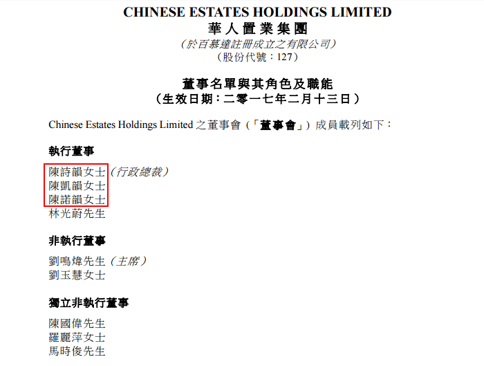 2月13日,新婚的刘太太陈凯韵(甘比)正式成为富商刘銮雄(大刘)旗下公司“华人置业”的执行董事。现在整个“华置”几乎变了甘比的家族企业:甘比姐姐陈诗韵出任华置执行董事兼行政总裁,妹妹陈诺韵出任执董,华人置业迎来了甘比三姐妹掌权时代。
