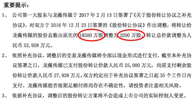 公告称,调整后的交易龙薇传媒将全部以现金形式进行支付,此前,龙薇传媒已支付 2.5 亿元,尚需支付 2.7928 亿元,双方约定应于补充协议签署之日起 35 个工作日内支付。