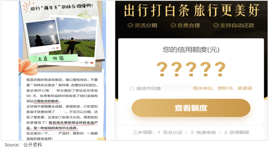 有些页面直接打出“出行打白条,旅行更美好”的口号,甚至找来年轻人的故事分享,鼓吹借钱旅游的好处。