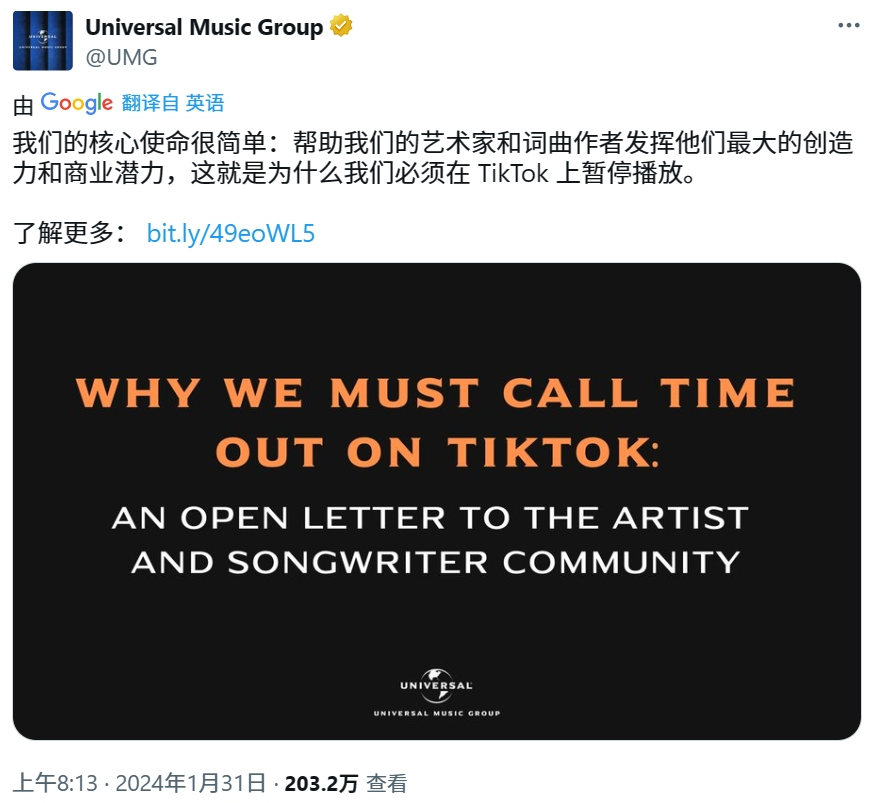 今年1月,环球音乐和TikTok爆发版权纠纷