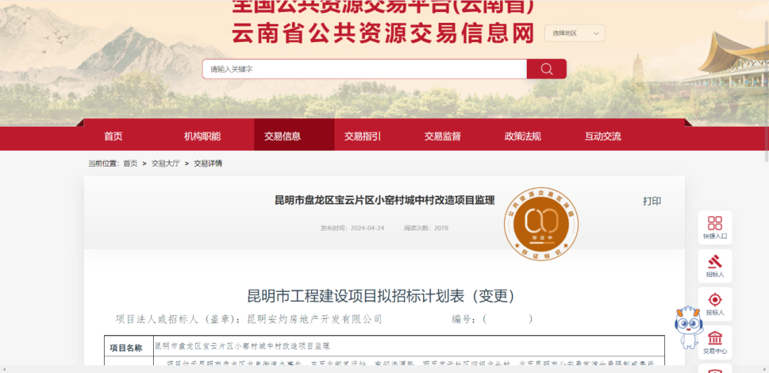 4月24日,昆明安灼房地产开发有限公司在云南省公共资源交易信息网上,发布了“昆明市盘龙区宝云片区小窑村城中村改造项目监理”招标计划,针对该项目监理工作进行公开招标。
