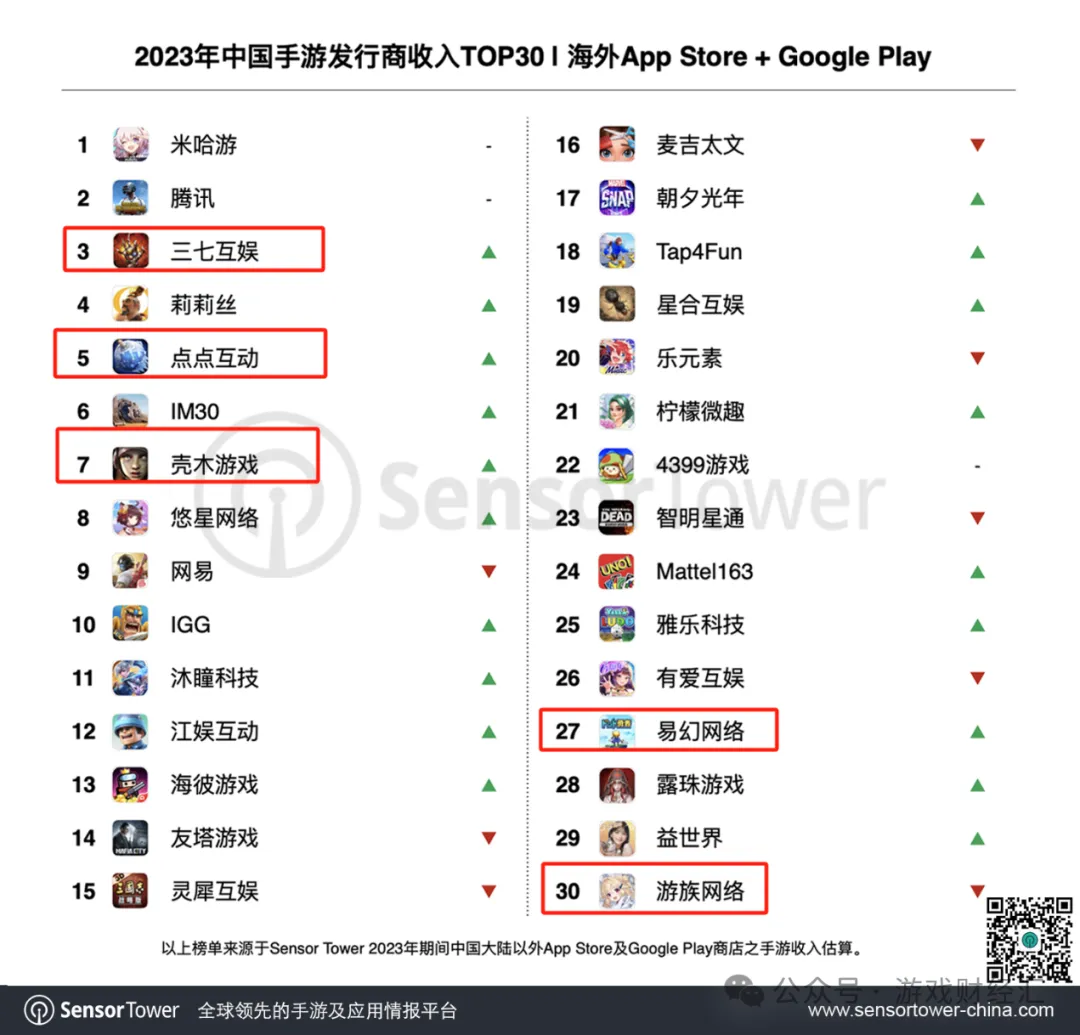 根据Sensor Tower数据, 2023年中国手游发行商海外收入榜TOP30,有5家A股游戏股上榜。其中,三七互娱位列第3,世纪华通旗下点点互动第5,神州泰岳旗下壳木游戏第7,宝通科技旗下易幻网络第27,游族网络第30。