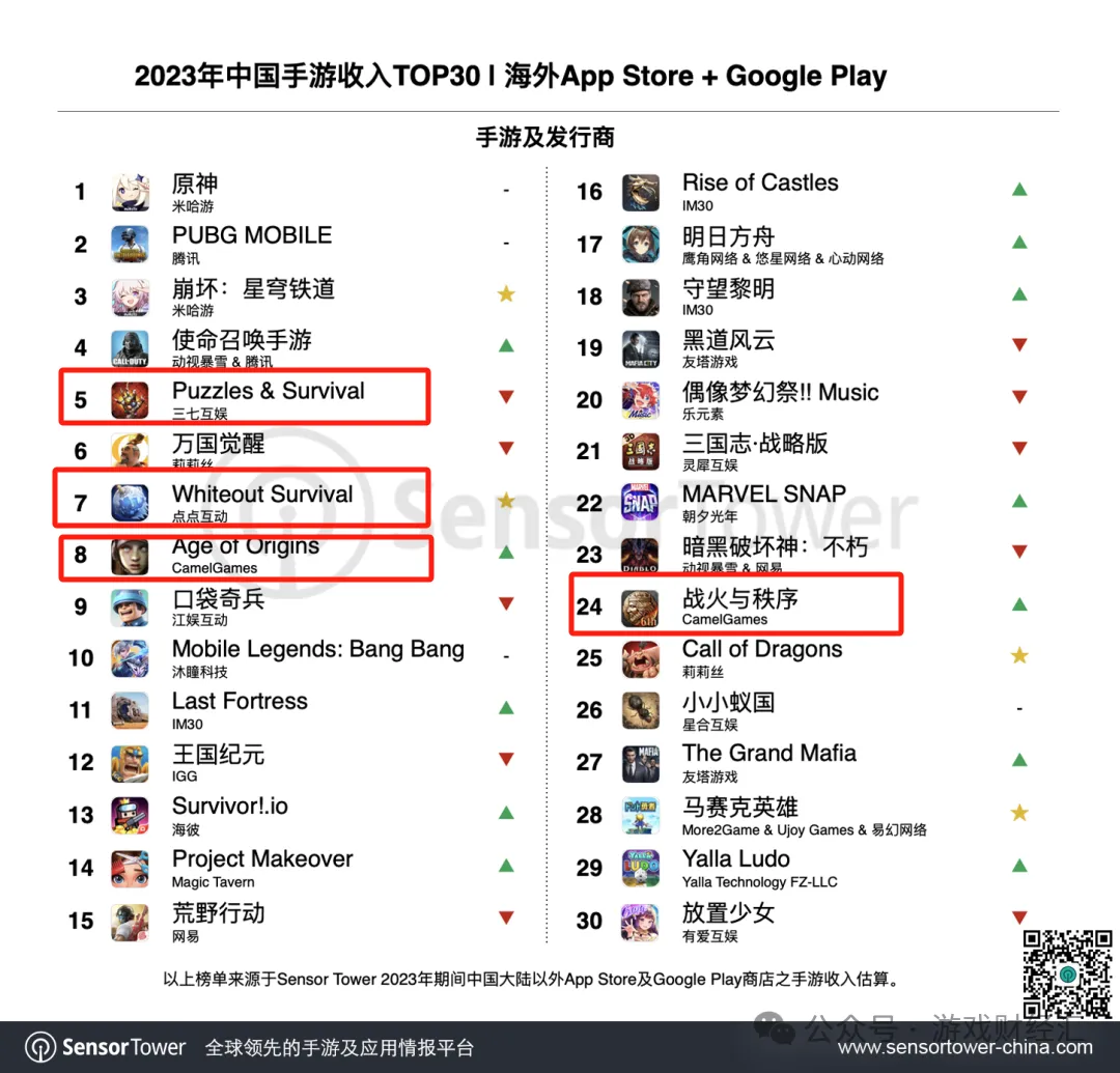 从产品维度来看,根据Sensor Tower发布的2023年中国手游海外收入榜,A股游戏股旗下4款产品入榜。三七互娱《Puzzles & Survival》位列第5,累计流水超百亿,点点互动《Whiteout Survival》第7,壳木游戏《Age of Origins》《战火与秩序》两款产品入围。