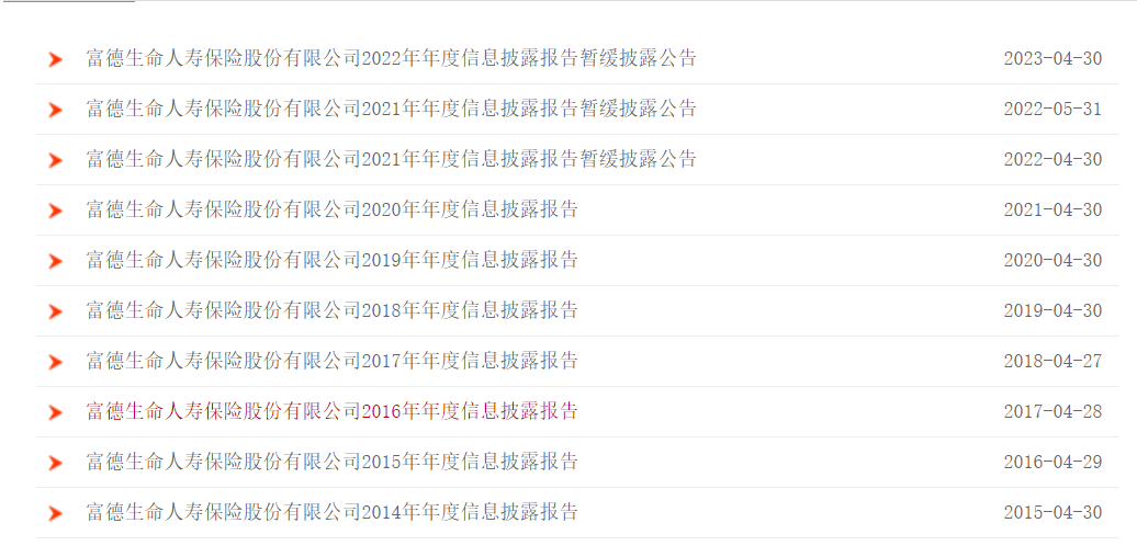 官网显示,富德生命人寿年度报告披露仅到2020年,该险企2021年、2022年两年均未披露年报。