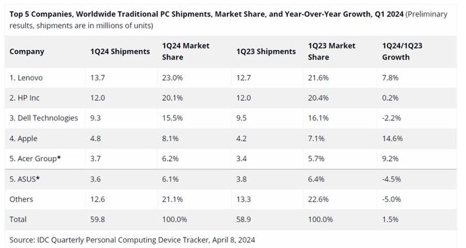 从第三方数据看,AIPC的出现的确拉动了市场,但效果有限。IDC数据显示,2024年Q1,全球PC出货量同比增长3%,结束了连续两年的下滑趋势,恢复到疫情前的水平。