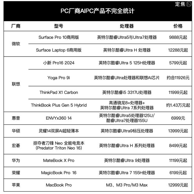 在PC厂商中,自带AI和操作系统两大优势的微软是带头人。去年,它陆续把类似ChatGPT的AI工具等整合进全线产品;今年3月,发布了自家的AIPC产品,Surface Pro 10商用版和Surface Laptop 6商用版。