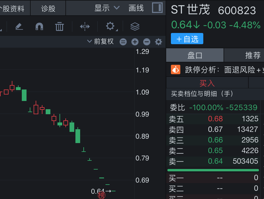 4月30日ST世茂(600823.SH)也披露终止上市的第四次风险提示,截至4月29日ST世贸已连续12个交易日低于人民币1元/股,4月29日现价为0.64元/股,即使后续8个交易日(不包含公司股票全天停牌日)连续涨停,也将因股价连续20个交易日低于1元而触及交易类退市指标。据悉,ST世茂的主营业务为房地产开发与销售、商业物业管理与经营及多元商业投资。