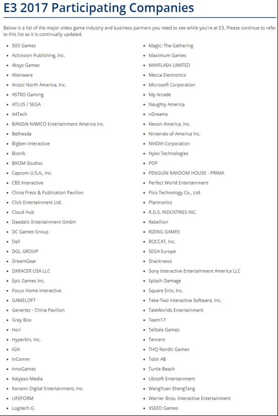 目前,E3的这一新变化得到了如微软、育碧等厂商的支持。根据E3官网信息显示,截至文创资讯发稿,已经有近80家厂商确认参加展会,包括微软、任天堂、索尼、SE,以及来自中国的腾讯、网元圣唐等游戏厂商。