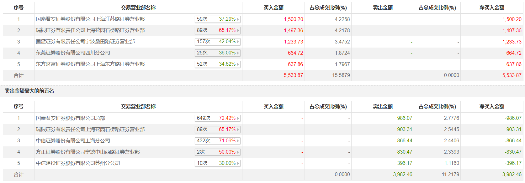具体来看,知名游资现身龙虎榜,章盟主(国泰君安证券上海江苏路证券营业部)、瑞银证券上海花园石桥路证券营业部分别买入1500.20万元、1497.36万元;国泰君安证券总部、瑞银证券上海花园石桥路证券营业部分别卖出986.07万元、903.31万元。