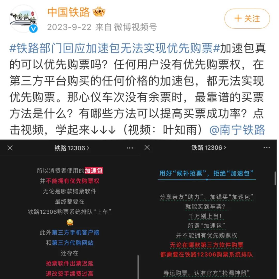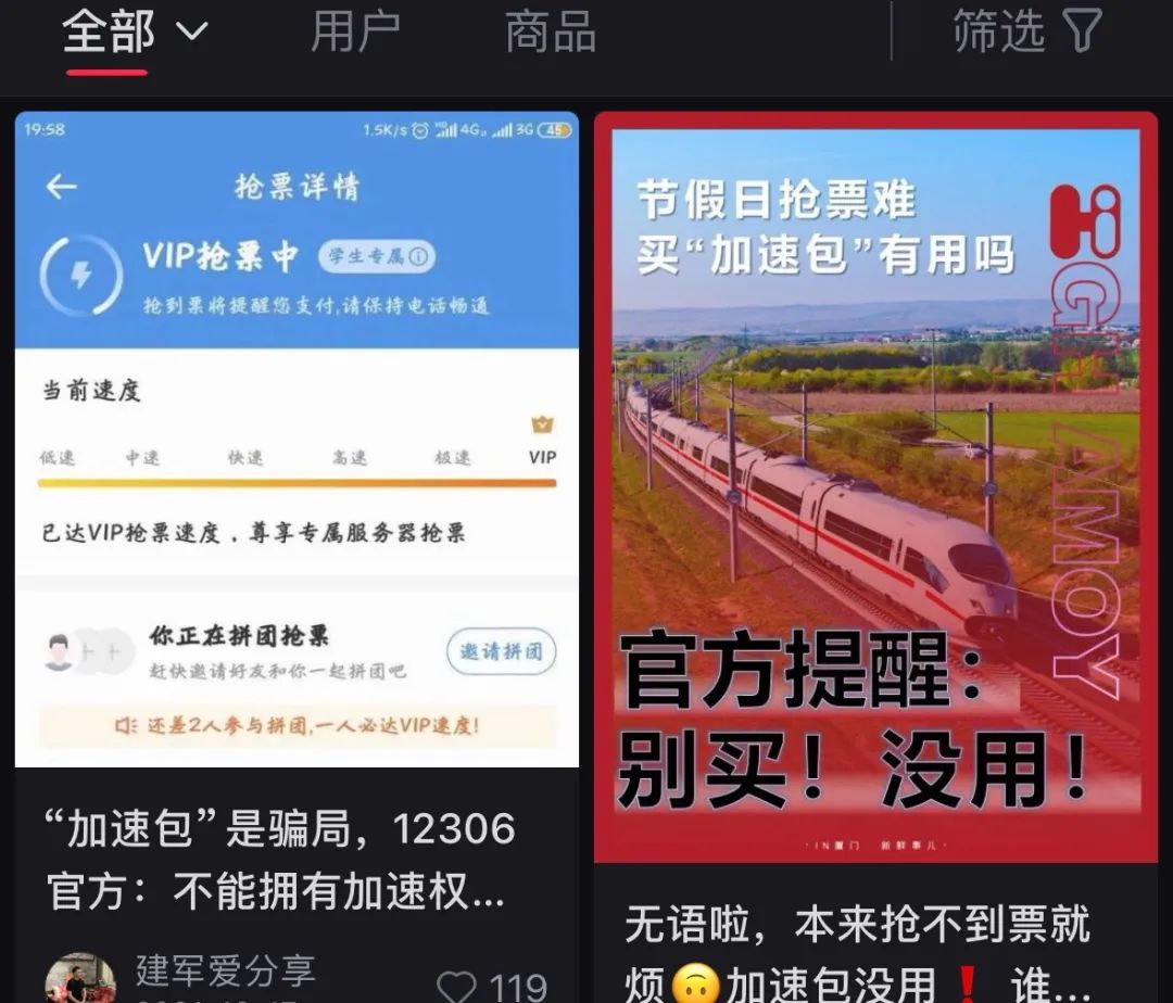 然而,当消费者实际出行时发现,这些高价抢票服务并未发挥作用,社交平台上出现了大量关于“加速包无效”“买加速包被坑”以及“第三方平台抢票避雷”的讨论。