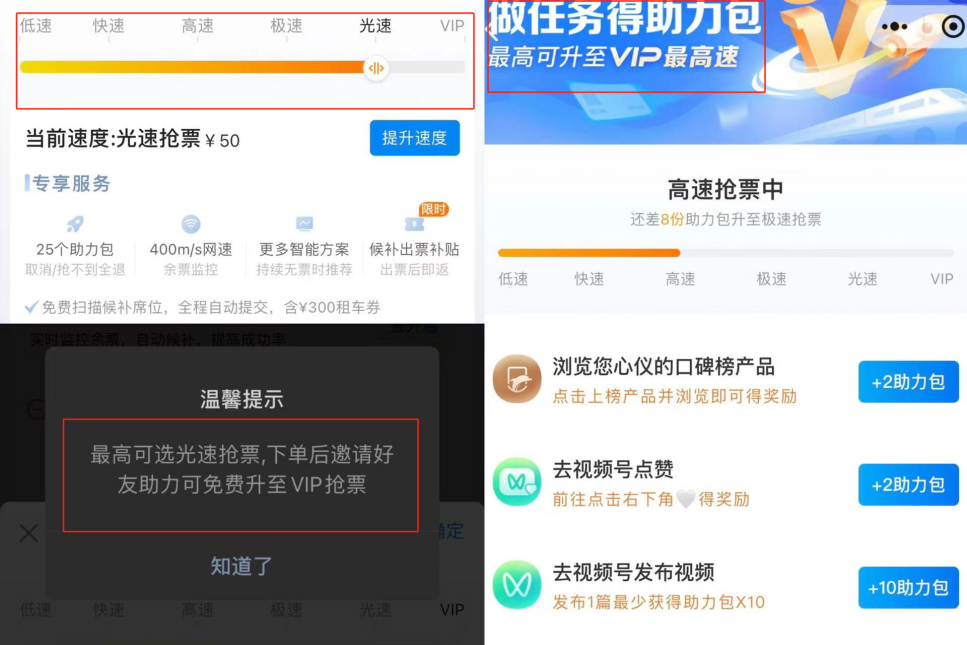 于是,不少第三方票务平台衍生出很多奇怪的抢票大法,助力包、加速包、加速卡等等,或者邀请众多好友助力,提升抢票速度。