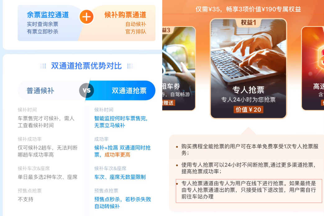剁椒通过实操发现,基本上所有的第三方票务平台都会标榜“双通道”、“专人抢票”等字眼,而所谓“双通道”就是候补购票+余票监控通道,一方面监控余票,同时用12306的候补抢票;“专人抢票”则是安排人员前往铁路12306线下渠道购票。