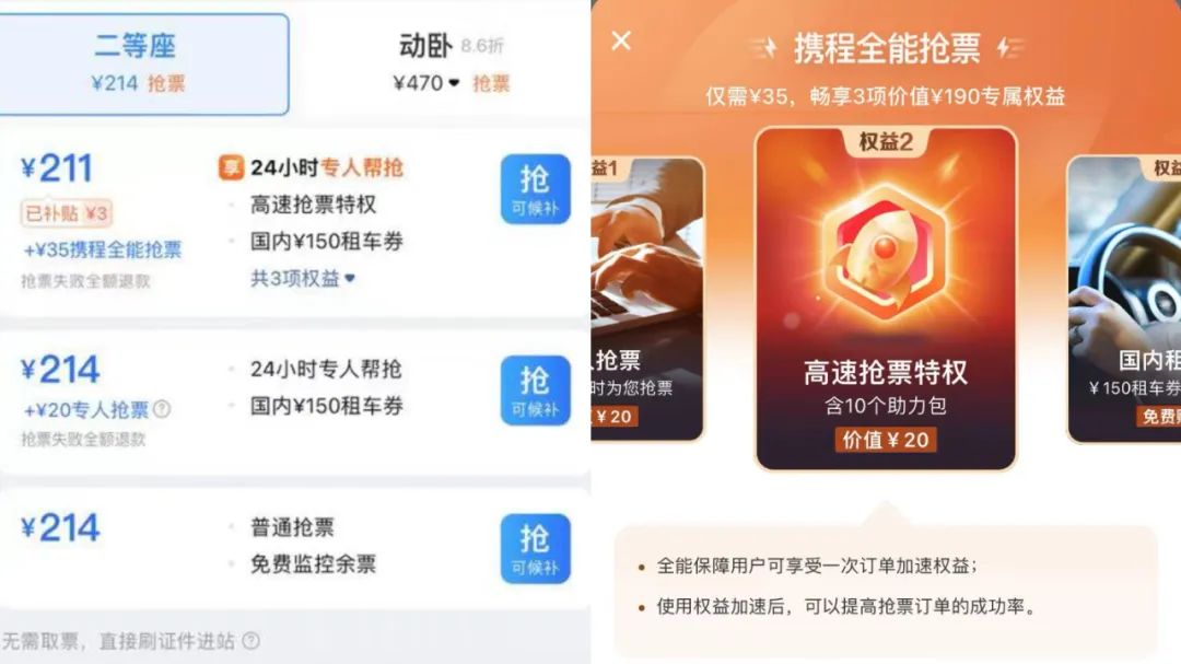 具体来看,以携程为例,平台在车票购买页面就提供了价值35元的“全能抢票”服务,包含了三项权益,分别是专人代抢、高速抢票特权和国内租车券,其中,高速抢票特权包括10个“助力包”,主要作用是提升抢票效率。