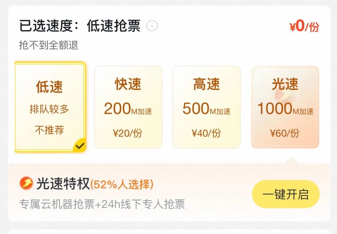 类似地,飞猪平台也有“24小时专人抢票”、“双通道”,同样也有加价增加抢票速度服务,从低速到光速,分别为20元、40元、60元。而用户也十分买账,平台数据显示,52%的用户都会选择价格最高的光速特权。