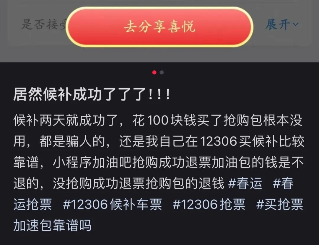 此外,还有用户表示,“花了60块买加速包,付完钱登录12306发现,只不过是候补订单又多了一条。”“抢票简直是门玄学,我花几十元买了加速包,20几个好友助力都抢不到的票,别人‘0元购’就在12306候补到了。