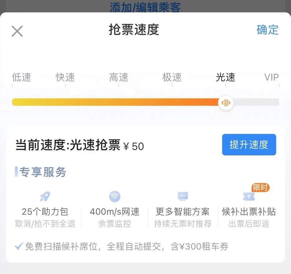 目前,除了官方12306之外,几乎每一个购票平台都会制造快速、光速、VIP等花样繁多、费用不等“加速包”概念,各平台在支付环节提示购买抢票“加速包”,这类服务通常让旅客误以为购买加速包就能显著提高抢票的成功率。