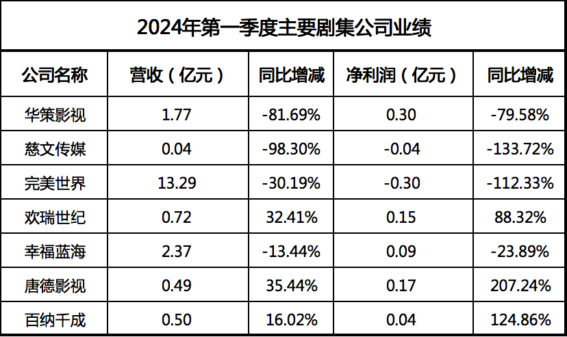 近几日,多家影视上市公司相继发布了2024一季度财报。根据犀牛君梳理,华策、完美、慈文等7家剧集相关上市公司一季度的净利润盈亏皆在亿元以下,甚至超半数公司是百万级。较低的利润空间,是大部分剧集公司面临的共同问题。