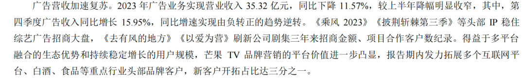 不过,多点开花的综艺,掩盖不了广告收入下滑的事实。2023年财报显示,芒果超媒2023年广告业务实现营收35.32亿元,同比下降11.57%,不知今年能否挽回颓势。