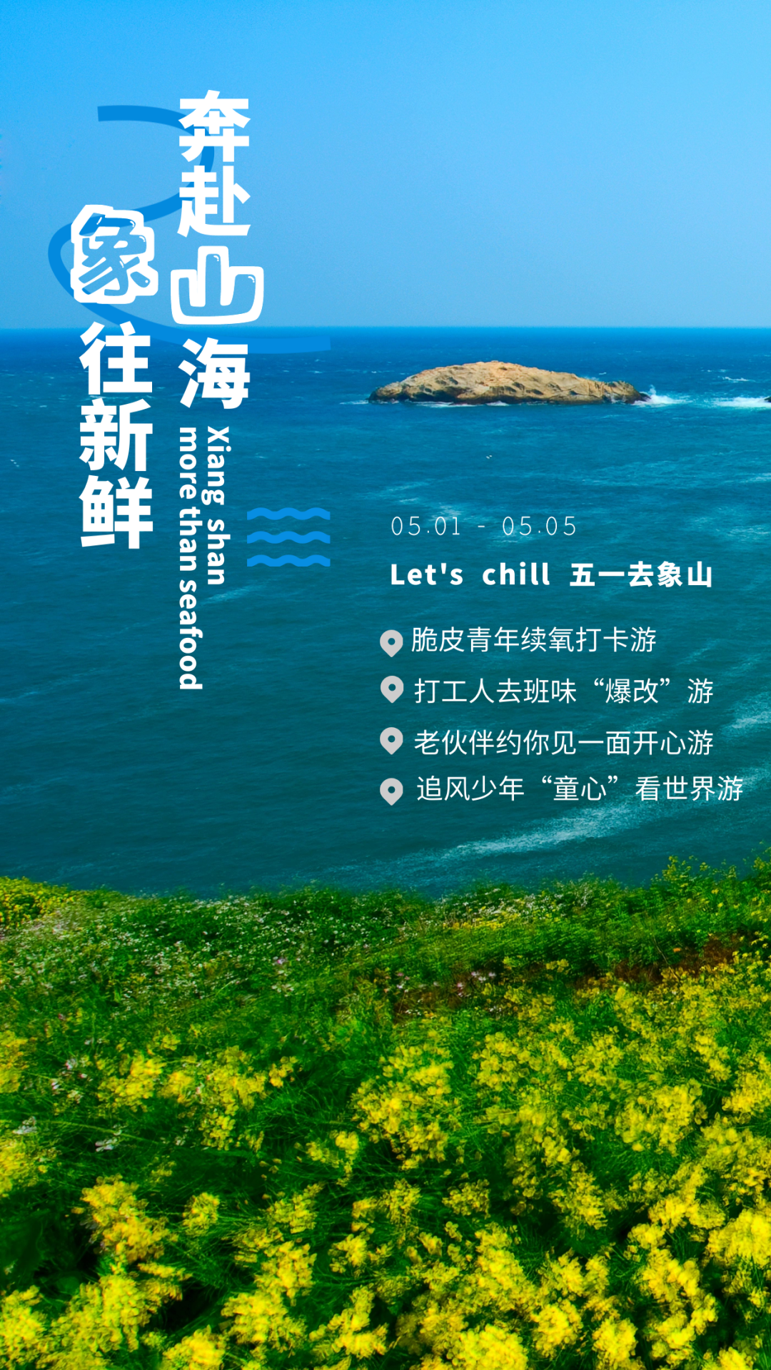 风吹哪页读哪页,随心而行。乘着北纬30度的海风在这个五月出发,奔赴山海,象往新鲜。5月1日至5月5日象山县推出脆皮青年续氧打卡游、打工人去班味“爆改”游、老伙伴约你见一面开心游、追风少年“童心”看世界游等系列活动。去象山chill,给心放一个假!