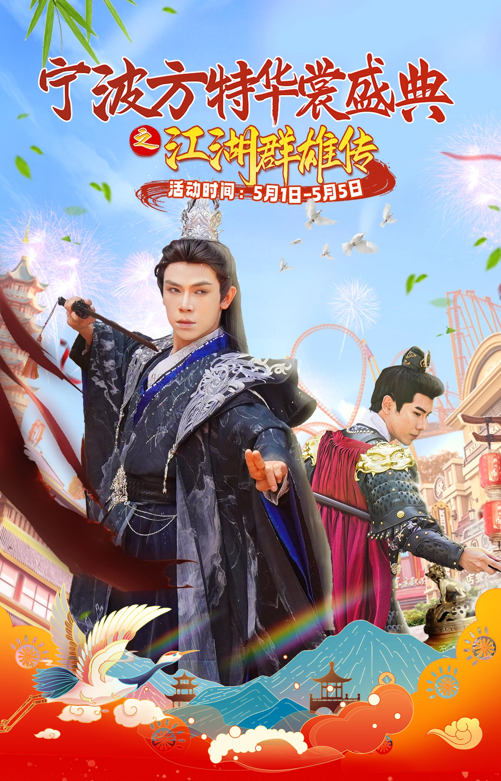 宁波方特景区“华裳盛典—江湖群雄传”活动国乐唱作,华裳大秀,“五一”假期到宁波方特与梦中的武侠撞个满怀。5月1日至5月5日,宁波方特旅游区邀众多古风爱好者和百万级国风红人共同参与,不仅有古风巡游、武侠主题T台走秀,还有高颜值NPC与游客互动,更有神秘飞行嘉宾空降园区,为游客带来汉服文化的视觉盛宴。方特东方欲晓更是开启“白+黑”超长待机模式,光影烟花秀点亮夜空,增添游园新趣味。
