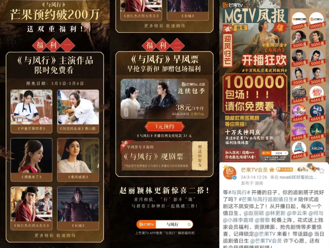 壹娱观察(ID:yiyuguancha)曾在《掀起腾芒“争产”大战》一文里深度剖出过芒果为了“迎凤归芒”所作出的极致努力,宣传力度空前——不仅归拢了站内赵丽颖参演的剧集、综艺,并推出“早凤票”,直接在会员价格上打出优势;同时,制作独家预告、与《楚乔传》的联动视频,并于开播前在马兰坡多渠道上线《与凤行》宣传物料;开播六小时倒计时时,芒果TV推出了一万场包场免费看活动,并发布28位艺人为剧集打call视频;甚至在剧集播出期间,更是举办了一场烟花宴,“芒着与凤行”将平台与剧集狠狠锁死……《与凤行》的极致,让市场看到了,双平台的所有关注重点终于走到了剧集。