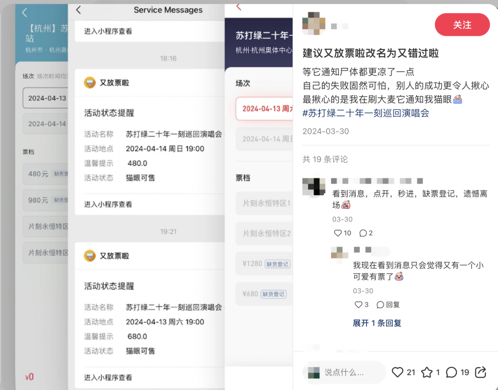 虽然有很多网友亲测后表示,“我压根没通知”、“用处有但不大,还是要拼网速”、“一直提醒有票,但点进去一张票没有”。但依然拦不住热情的歌迷,热门演出开票期间,第三方监测小程序甚至会因为人数过多出现BUG。