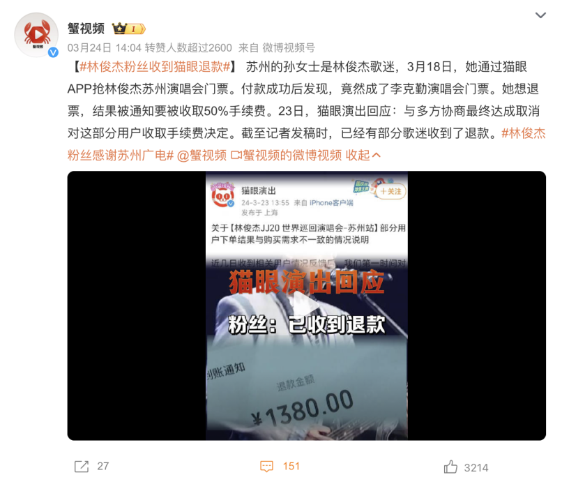 今年3月,有网友投诉在猫眼上买了林俊杰苏州演唱会门票,付款成功后发现是李克勤演唱会门票,而且退票需要收取50%手续费。最终猫眼演出回应,“与多方协商最终达成取消对这部分用户收取手续费决定。”