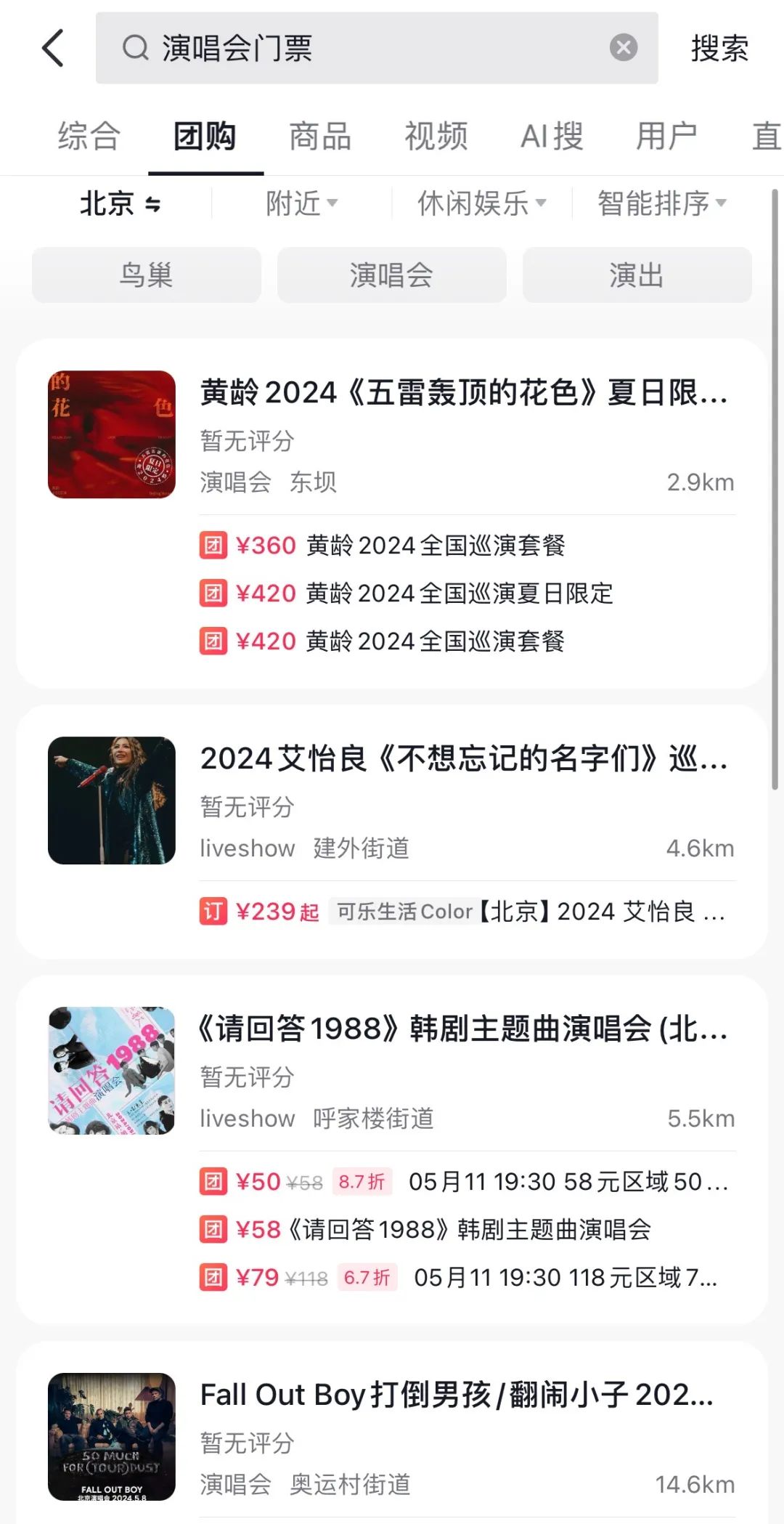 而且,用户直接搜索“演唱会”、“演出”等关键词,也能出现附近的演出门票相关信息,可以直接购买。
