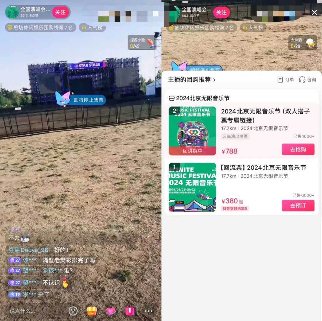 另一种则是在抖音上进行直播带票,虽然直播带货已经普及,但直播带票相对而言还是新方式。4月30日下午,即北京无限音乐节开演前一天,@全国演唱会门票一边直播演出现场、彩排情况,一边卖票。购物车中,有售价788的双人搭子套票和380的单场回流票。