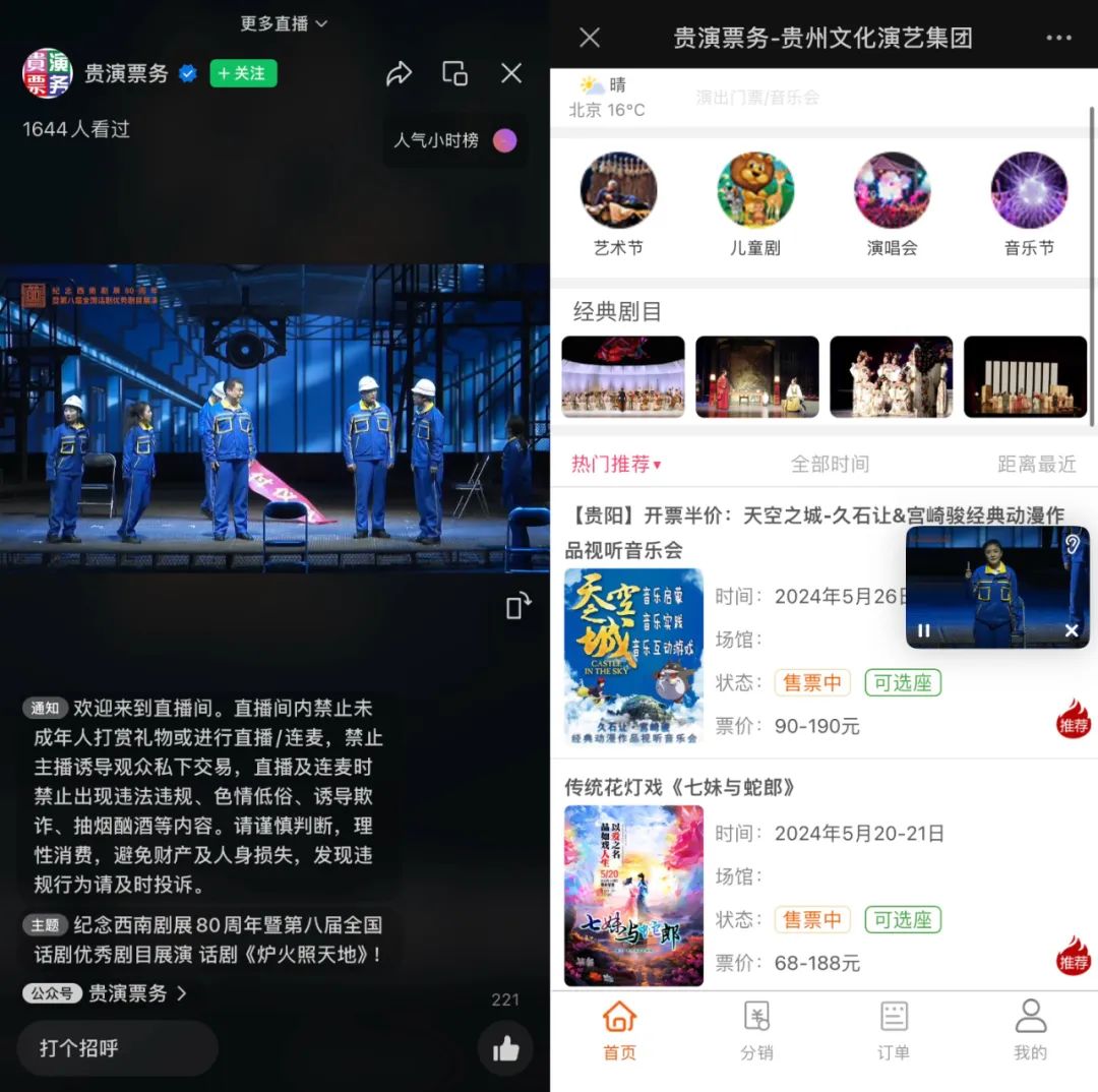 4月30晚上,@贵演票务在视频号直播话剧《炉火照天地》,但直播间目前还没有挂票务链接,用户可以点击@贵演票务头像进入公众号,在“服务”板块买票。这种方式结合了内容+售票,对于用户来说,是可以边种草边下单的方式。不过,目前视频号票务相关的直播还相对较少。