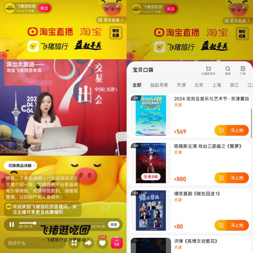 此外,淘宝直播也成为演出门票的直播渠道。飞猪旅行官方直播账号@飞猪逛吃团不仅直播带景点门票,在4月17日的“跟着演出去旅行”的主题直播中,还售卖泡泡岛音乐与艺术节、Jake Miller 2024 Tour北京站、黄龄2024巡演北京站等多场演出门票,此外,还包括音乐剧《觉醒年代》、沉浸式悬疑剧《穹顶弥声》等演出门票。