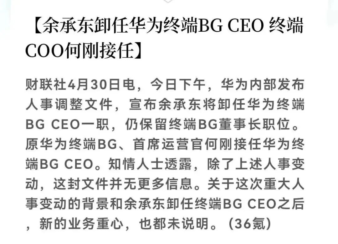 正因为此,在五一假期前,“余承东卸任华为BG CEO”的重磅新闻刷了屏,让人意外,让人震惊。很多媒体都紧急安排人手对此进行报道,小雷也认为这一消息事关重大,对数码圈影响巨大,因此赶紧重新计划假期安排,对这一事件进行解析。