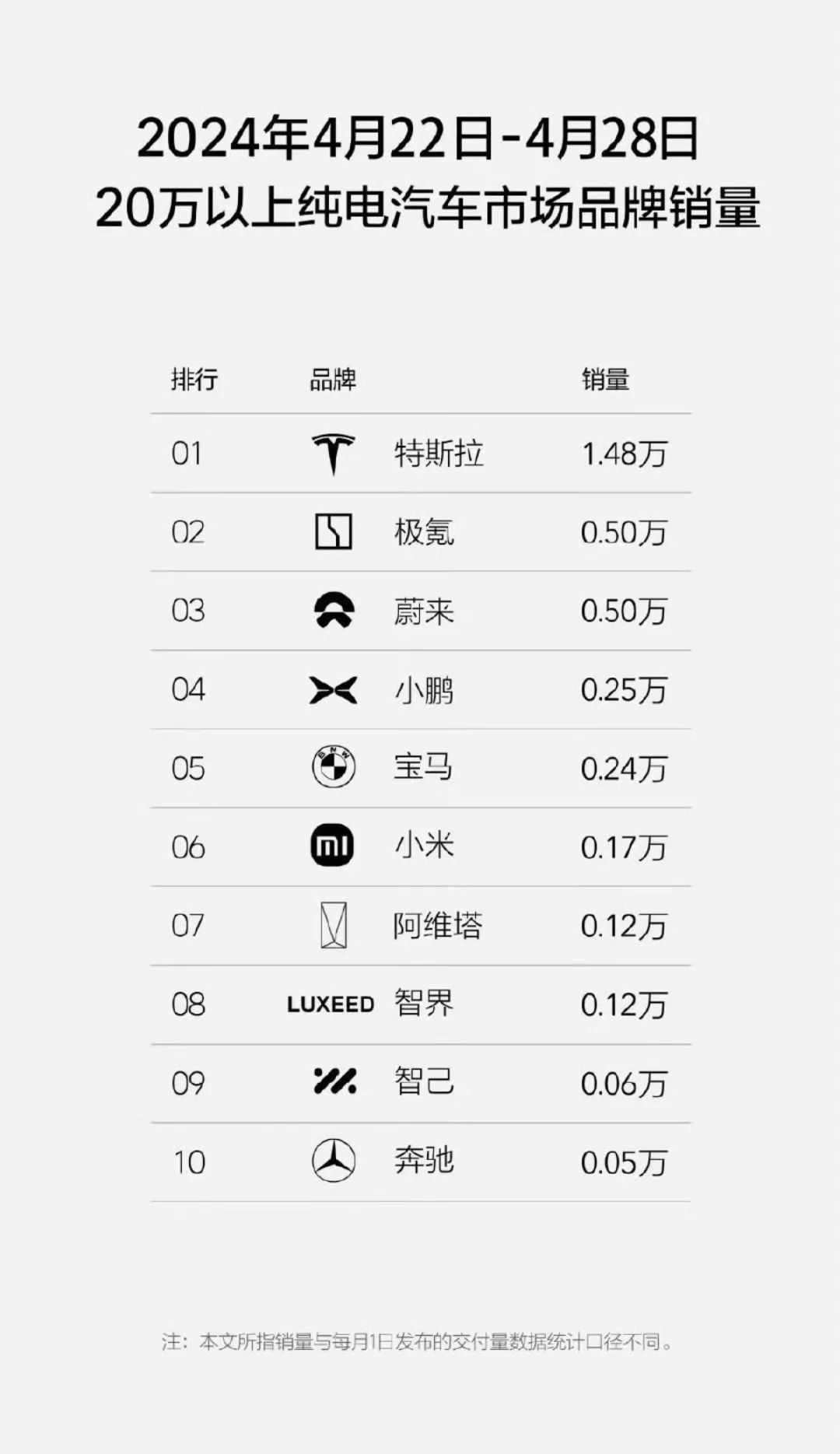 至于华为和奇瑞合作的智界S7,虽然在合作初期有过一些协作上的不顺,但在今年二次发布后也算是走上了正轨,目前智界S7周交付量在1200辆左右,在国内20w以上纯电汽车市场也算排得进前十位的新品牌了。