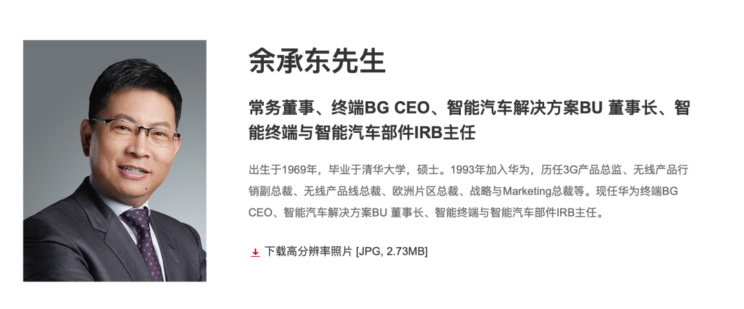 华为官网的信息显示,目前余承东的职位分别是:华为常务董事、终端BG董事长、智能汽车解决方案BU董事长、智能终端与智能汽车部件IRB主任。