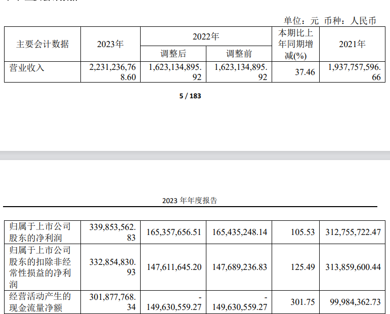伊力特2023年年报显示,公司全年实现营收22.31亿元,同比增长37.46%;归母净利润3.40亿元,同比增长105.53%;利润总额为4.58亿元。