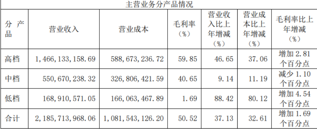 而低档酒全年产量同比增幅最高,达到74.99%。从营收来看,该档次产品的增幅也是最高的,为88.42%。