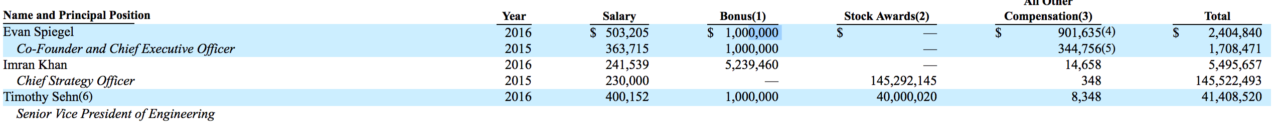 另外,2016年,Spiegel有240万美元的薪酬,具体包括50万美元的基本薪资,100万美元奖金,90万美元人寿保险费。但当公司成功上市时,Spiegel的基本薪酬降为象征性的1美元,而且除非董事会决定,将不享受任何奖金。