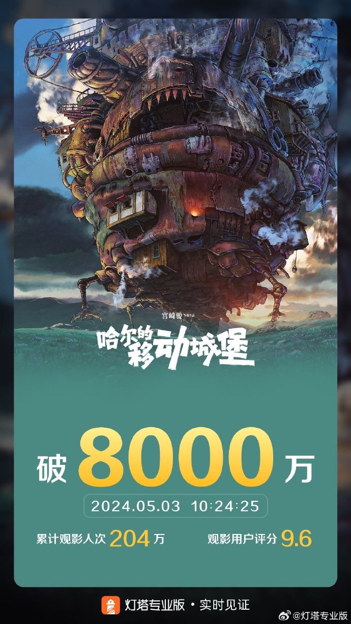 据灯塔专业版实时数据,截至5月3日10时24分,影片《哈尔的移动城堡》票房突破8000万。