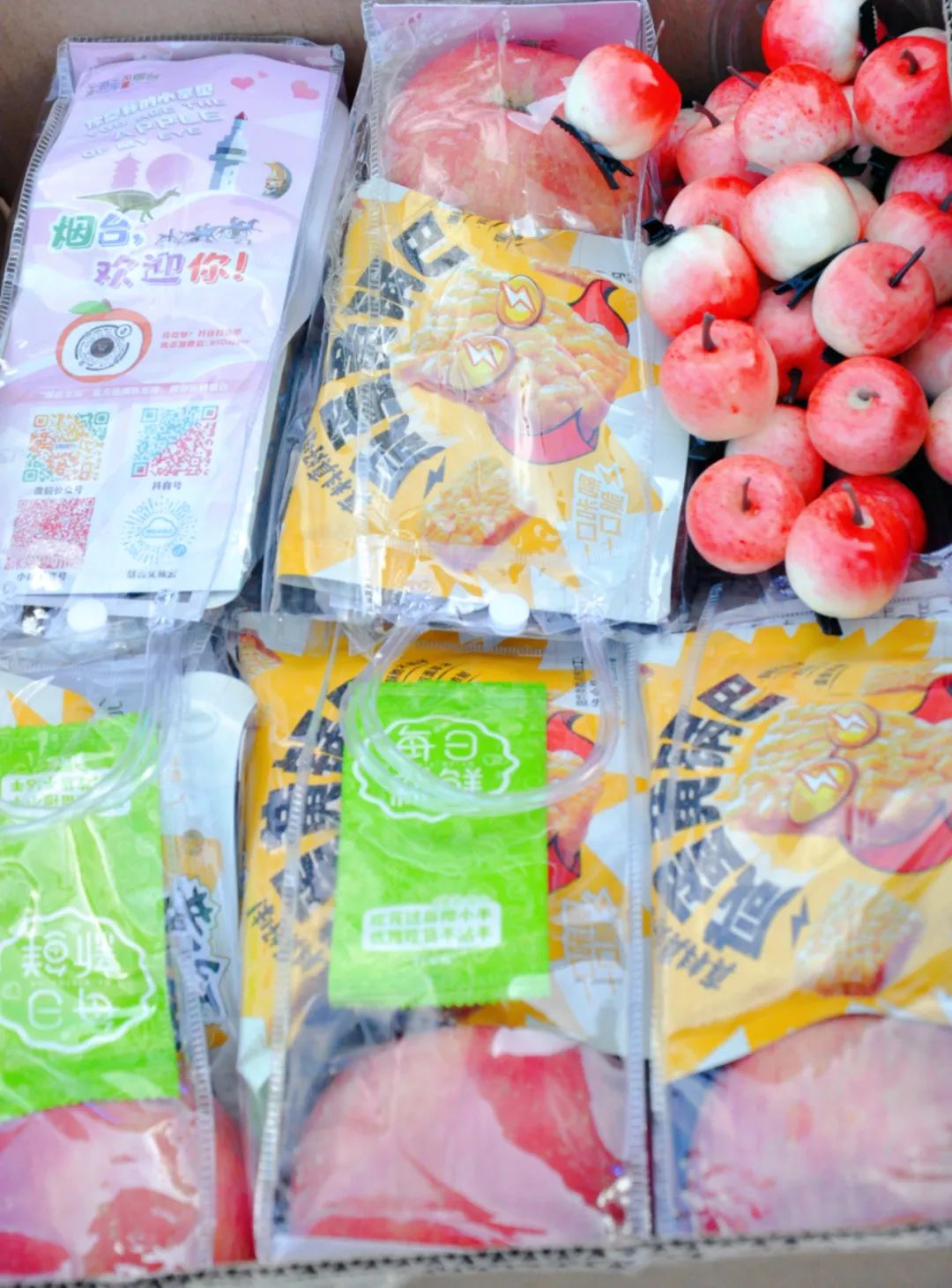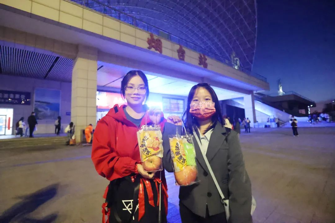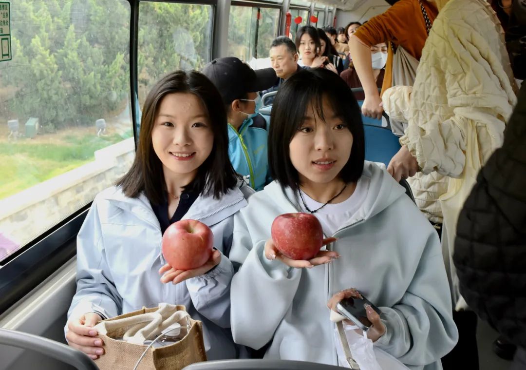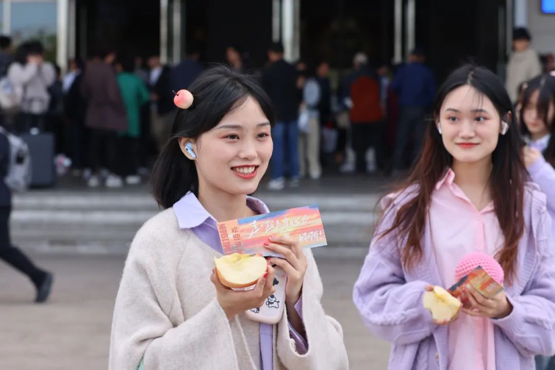 为表达烟台热情,烟台市博士达有机果品专业合作社工作人员也从栖霞赶赴到接站现场,与志愿者一起,将一个个饱含温度的“烟台苹果”送到游客手中,邀请游客现场品尝脆甜多汁的烟台苹果。