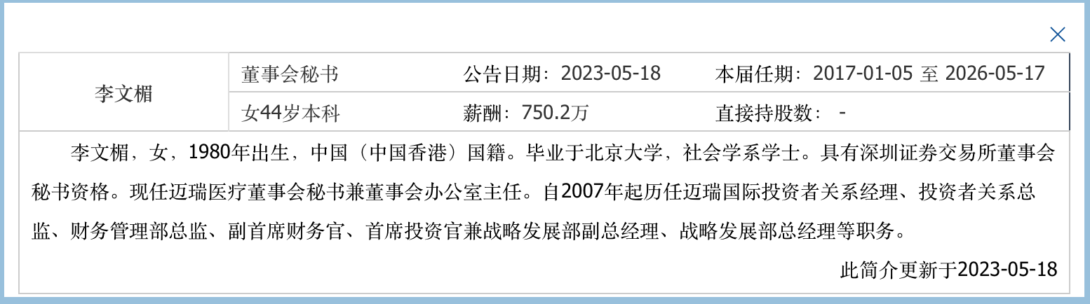 迈瑞医疗(300760.SZ)的董秘李文楣以750.22万元的薪酬位居第二。作为国内医疗器械龙头,迈瑞医疗给这位80后董秘开出的薪酬也很霸气。资料显示,李文楣1980年生,毕业于北京大学,社会学系学士,自2007年起历任迈瑞国际投资者关系经理、投资者关系总监、财务管理部总监、副首席财务官、首席投资官兼战略发展部副总经理、战略发展部总经理等职务,现任董秘兼董事会办公室主任。实际上从2022年情况看,李文楣也以723.77万元的薪酬位于金字塔尖。
