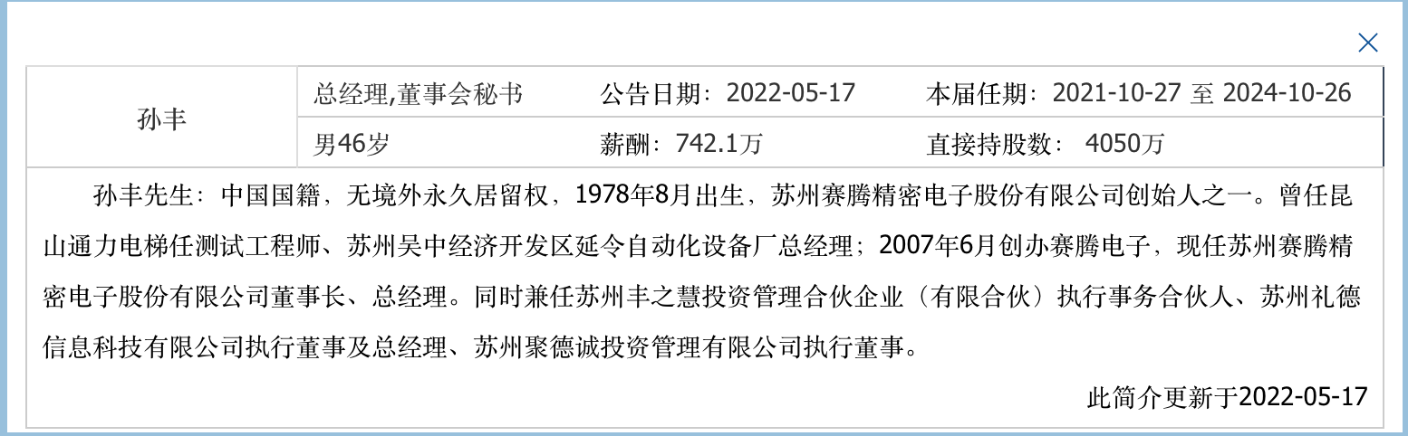 赛腾股份(603283.SH)的董秘孙丰,实则也是公司的董事长、总经理,在2023年的薪酬为742.09万元,其本身还持有4050万股赛腾股份。资料显示,孙丰1978年8月出生,赛腾股份创始人之一,曾任昆山通力电梯任测试工程师、苏州吴中经济开发区延令自动化设备厂总经理。孙丰在2022年时的薪酬也有690.92万元,跻身三甲。