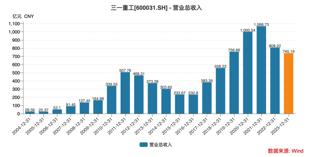 早在2020年,三一重工营收就曾突破千亿,还在2021年达到了1068.73亿元。