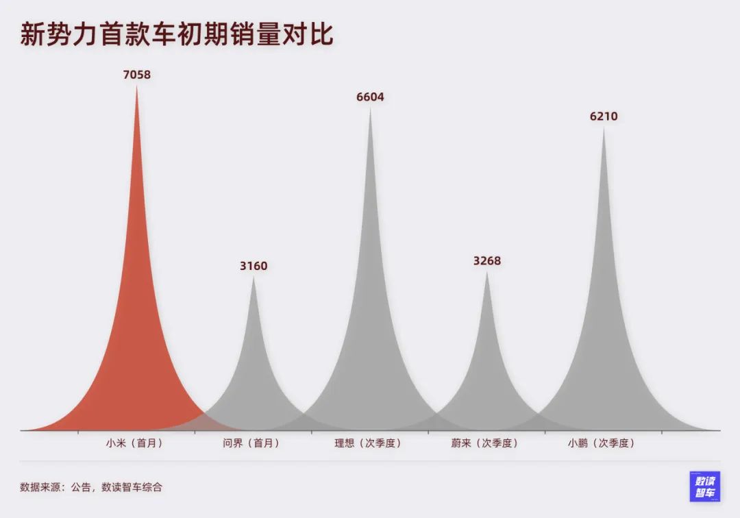 这样一个非大规模交付的月份,小米的交付量最终为7058台。参考其它车企,蔚小理正式交付的第二个季度也都没有达到7000+,华为首月交付量3000+,无论是交付时间还是交付量,小米都是大幅度超越。这与行业发展阶段相关,但小米Su7的这份成绩单足够亮眼。