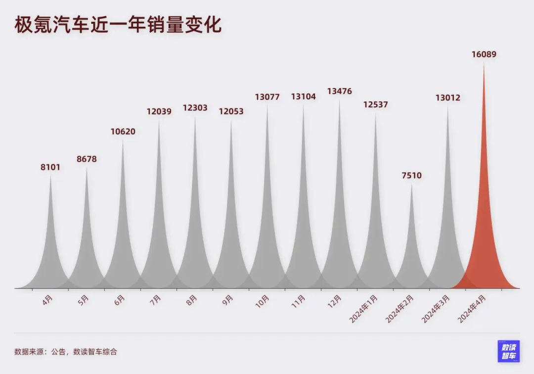 长久以来,极氪除了001表现亮眼,后续产品的销量迟迟打不开局面。从极氪001至今,月销量始终没有突破1.5万台,最接近的一次只有去年12月的13476台。本月,在001的改款发布后,极氪销量终于突破了瓶颈,达到16089台。