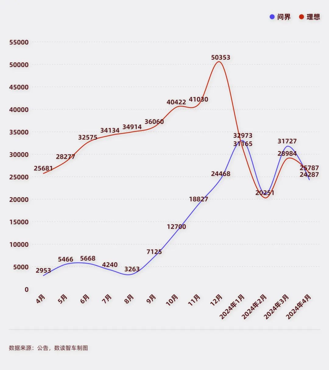 4月,理想交付量25787台,超越问界的24287台,这是1月被问界超越后,今年以来首次实现反超。